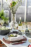 De flätade bordstabletterna kommer tillbaka och kombineras med fördel med brun och/eller grå keramik. Här förstärks den naturnära känslan av bordsdekorationer i form av miniväxthus, medan glasen och den höga vasen adderar enkel elegans. Allt från House Doctor.