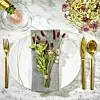 Växter – både levande och torkade – fortsätter förgylla våra dukningar. Plocka de blomster som finns tillgängliga (stjärnflocka blommar först i juni–juli), knyt ihop med ett fint snöre och lägg på en rustik linneservett. Besticken och vasen i mässing bidrar med lyxkänsla. Porslinet kommer från Fyrklövern