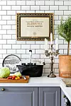 På kakelväggen sitter en tavla som Karin fått av sin pappa. Den hopfällbara picknickkorgen har Karin haft länge, liknande finns på till exempel Jula. Bricka, kandelaber och terrakottakruka är loppisfynd. Foto: Karin Johansson