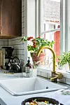 Blandare i obehandlad mässing från Tapwell och diskho i porslin från Ikea. Foto: Karin Johansson