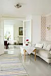 Möbler bör ha en funktion. Har de inte det så kanske man kan ändra lite på dem? Till exempel genom att kapa benen på bord, så att de kan fungera som soffbord. På väggen hänger tapeten "Pigkammaren" från Boråstapeter.