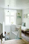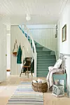 Ibland är det bra att bryta av färgskalan. Som trappan inomhus, som är målad i en turkos nyans som går igen i badrummet. Lägg märke till bänken – gjord av tre gamla sparkstöttingar.