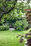 Ett av de många gröna rummen i trädgården. Här leder en vindlande stig av plattor över gräsmattan bort till växthuset.