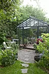 1. Använd kontraster i färg för att skapa rum. Låt till exempel växthuset fortsätta ut i trädgården en bit genom att anlägga en grusad uteplats där det ljusa gruset hänger ihop visuellt med växthusets golv och avgränsas av gräsmattan