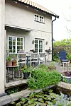Uteplatsen med fiskdamm helt nära huset för tankarna till sydligare breddgrader. En ligusterplanta har spritt sig hit och får breda ut sig längs med trädäcket. I dammen lever guldfiskar under ett skyddande täcke av vita näckrosor. På vintern läggs ett nät över för att skydda mot hägrar som annars letar sig hit för ett skrovmål.