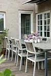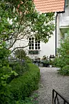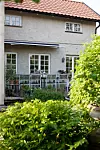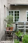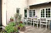 Vid husets utbyggnad har en trivsam uteplats skapats. Stolarna är i teak och köpta i en numera nedlagd affär.