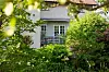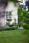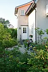 I juni slår favoritrosen ut, den aprikosfärgade Austinrosen Port Sunlight som sedan blommar hela sommaren. Huset är putsat med jurakalk som inte är målat. Fönstren är original sedan huset byggdes 1911.