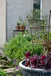 I krukorna växer agapanthus och jätteverbena. På vardera sidan om dörren står en kruka med rödbladig dvärgpersika som ger mycket frukt.