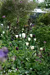 Vita tulpaner tillsammans med den svarta tulpanen Queen of Night i en av de prunkande vårrabatterna.