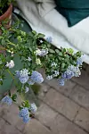 På bordet står en blå säckbuske, Ceanothus x delilianus. Det svenska namnet motsvarar inte alls dess skönhet och därför ser man också det engelska namnet, Kalifornisk syren.