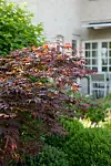 Maria har valt att här och var plantera mörkbladiga växter. De gör sig fint tillsammans med lila och vita blommor mot trädgårdens gröna bladverk. Här en mörkbladig japansk lönn.