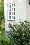 Den formklippta buxbomen längs med gräsmattan leder fram till husets ingång. Maria och Lars har valt att ha många vintergröna växter på husets framsida för att det ska vara fint året om. Tre uppstammade järnekar växer i rabatten innanför buxbomen och på vintern blir det en prydnad med de röda bären.