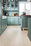 Naturmaterial som känns varmt, mjukt och tidlöst. För köket kan det vara bra att välja ett hårdare träslag som ek, lönn, ask eller bok. Välj mellan såpskurat, oljat, vaxat, lutat, kalkat, betsat, målat eller laserat. Underhålls med våttorkning och såpa. Kan läggas på egen hand.