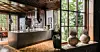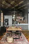 Matsalen badar i ljus och färgskalan går i brända toner med rustik ek och mörkt läder. Bord och stolar, Dis Inredning. Taklampan och mattan är köpta i Marrakech.