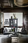 Vardagsrummets tak pryds av en storslagen takmålning. Det svarta skåpet är ett ommålat Ikeaskåp. Soffbordet är inköpt på en av alla resor till Marrakech. Soffa och fåtöljer, Sits.