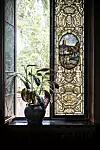 De spröjsade fönstren i köket vetter ut mot trädgården.