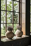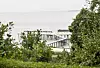Från matsalen når man den generösa terrassen, med utsikt över sundet. Den stora urnan är köpt utomlands.