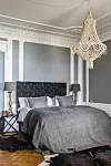 Sovrummet går, till skillnad från de övriga rummen i bostaden, i ljusa toner med vita stuckaturer på väggar och tak. Sänggavel, Dis Inredning. Överkast, Cosy Living. Taklampa i makramé, Olsson & Jensen. Sänglampor, Butik Linnea.