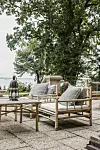 Den stenbelagda terrassen är omgärdad av grönska, och en bred trappa leder ner till trädgården. Loungemöbler i bambu, Tine K. Kuddar, Mondaii. Keramik hemtagen från Marrakech.