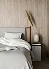 En fin sänggavel och ett vackert sängbord ger sovrummet en elegant touch. Asiatiskt inspirerad sänggavel ”Norm” i textil, trä och läder, av Norm Architects för Dux. Kontinentalsäng ”Dux 5005”, med extra mycket komfort.