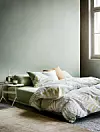 Lugna färger på väggarna och en mjuk matta att sätta ner fötterna på gör uppvaknandet mer harmoniskt. Påslakanset ”Sanne” i extra fin bomull och ”Frøya” i ekologisk bomull, Høie of Scandinavia.