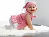 Mössa: Sy ihop mössan i sidan och upptill. Använd kantm till sömsmån i sidan. Gör 2 snoddar cirka 10 cm långa. Gör två små bollar, ca 2 ½–3 cm i diameter. Fäst en boll i ena änden på vardera snodd. Sy fast en snodd upptill i varje hörn på mössan.