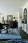 Matbordet med antik mangelskiva har Caroline ärvt från sin farmor. Stolar, Gubi, matta, Layered, skänk från Newport, bordslampa, Oscar & Clothilde. Tavlan är en scarf som ramats in.