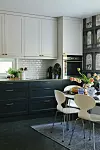 Köket från Järfällakök har svarta underskåp, vita överskåp och bänkskiva i portugisisk kalksten. Runt Bruno Mathssons ”Superellips”-bord står ”Myran”-stolar. Porslin ”Ostindia”, vas från Oscar & Clothilde. Matta, Åhléns. Tapet ”Procuratie con Vista” från Fornasetti.