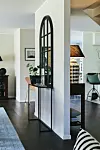 På väggen mot hallen står ett sidobord från Dis Inredning, med ärvda ljusstakar och gummikruka från Royal Design. Spegel med spröjs från Design Country House. Den svartvita lampan på andra sidan väggen kommer från Frejas Boning.