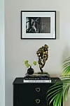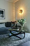 Caroline gillar svarta detaljer. Soffbord ”Newton”, Karl Andersson & Söner, lampa ”Wave Optic Smoke”, Dis Inredning, svart vas, Georg Jensen och svart lackask, Oscar & Clothilde.