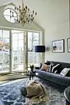 På övervåningen finns en dörr som leder ut till den stora terrassen. Soffa, Melimeli, soffbord, Tom Dixon, Matta, Kilands Mattor, taklampa ”Sarfatti” från Flos, puff, Zara Home, golvlampa, Newport.