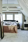 Master bedroom har takbjälkar och ett härligt ljusinflöde. Sängkläder, Hemtex, överkast, Hans Mikaels, pläd, Butik Grön, sängbord inköpta på auktion, sänglampor, Laura Ashley, gardiner från Ohlssons Tyger. Väggarna är målade i kulören ”S3005-Y20R”.