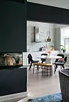 Eldstaden från Contura skapar en mysig atmosfär i vardagsrummet, och syns även från köket. Den mörka väggen har färgkod NCS S 8000-N. Vitpigmenterad ekparkett från Alloc har lagts på båda våningarna.