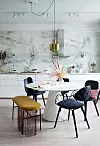 Ett runt matbord skapar trevlig gemenskap. Bordet är från Pedrali och stolarna från Ikea och Magis. Bänken från Jysk har redesignats av Ida. Spegeln är vintage och piedestalen är köpt på auktion. Taklampan är också ett antikfynd. Väggen är målad i färgen NCS S 2000-N.