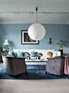 Den runda Hay-lampan är rummets blickfång och skapar dramatik. Soffan är från Tine K Home. Sidobordet är ett vintagefynd för ett par hundra­lappar. I soffan kuddar från bland annat Princess och Kremmerhuset. Ida har själv sytt den med fransar. Tavlan köptes på ett museum i London, där Ida och Eirik var på bröllopsresa.