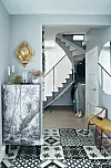 Betongväggen i trapphuset fortsätter hela vägen upp till loftet och är 10,5 meter hög. Golvet har marockanskt kakel från Far-far, och väggen är målad i färgen NCS S 2000-N. Skåpet i förgrunden är från Ikea. Fronten har Ida själv designat och benen är från prettypegs.com. De har även fronter till Ikea-möbler. Den runda spegeln är från House Doctor.