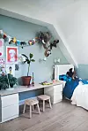 Pojkarna har varsitt sovrum, och det här är den yngstas. Det platsbyggda skrivbordet har Ida tillverkat av sängbord från Ikea och bänkskivor från Maxbo. Mjukdjuren på väggen är från jollyroom.no. Säng och lampor är också från Ikea. Väggarna är målade i ”Minty Breeze” från Jotun. Över skrivbordet hänger en blandning av familjebilder och bilder från desenio.no.