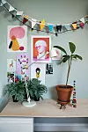 Färgstarka bilder, gröna växter, en pappersgirlanf och kulörta lyktor sätter stämningen i yngste sonens rum.