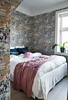 I gästrummet har Ida tagit ut svängarna och frossat i den mer pampiga herrgårdsstilen som hon också gillar. Tapet ”Bengal” från Manuel Canovas.