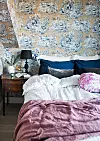 Sängkläderna är från Ikea och Kid. Överkastet är en duk från Kid. Både nattbordet och mässingshästen är antikfynd. Den klassiska tapeten ”Bengal” från Manuel Canovas är en av Idas favoriter som hon aldrig tröttnar på.