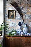 På en vacker gammal skänk i gästrummet finns stilleben med vaser i blått och vitt. Över hänger en gammal målning, från loppis precis som vaserna.