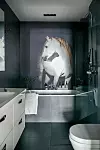 Hästbilden på badrumsväggen är rummets centerpiece. Ida har byggt upp hela badrummet med både kar och dusch kring den stora bilden, som är tryckt på aluminium på Copy Cat. Klinkerplattorna är från Megaflis och tvättstället från Ikea. Badkar från Villeroy & Boch, blandare från Tapwell.