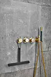 Metall fungerar ihop med mörka nyanser – som här där mässing, svart och grått kombinerats på ett fint sätt. Svart badrumsskrapa från Menu.