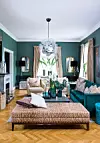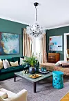 Väggarna i vardagsrummet målades i en djupt grön färg, "Emery Green" från Zoffany.