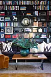I det kombinerade biblioteket och tv-rummet har tavlor både hängts och ställts i den stora väggfasta bokhyllan som täcker en hel vägg. Effekten är både intressant och kontinental. Utplacerade prydnadsföremål här och där gör att man undviker att få en massiv vägg av böcker. Möblernas och textiliernas dova färger kompletterar varandra och skapar en ombonad och inbjudande stämning.