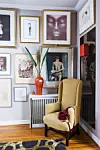 I gången mot hallen valde inredarna också att skapa ett konstgalleri i miniformat – detta genom att samla många tavlor i olika tekniker och storlekar och sätta dem tätt ihop, från golv till tak.