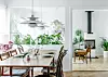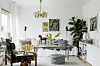 Familjen har satsat på många sittplatser där de kan umgås. I ena delen av vardagsrummet står ett runt glasbord köpt på loppis. Taklampan "Taraxacum Cocoon" från Flos köpted via Instagram. Oljemålning av konstnären Johny Colebring.
