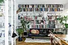 Genomgångsrummet som också rymmer matplatsen innehåller också ett bibliotek. Här står en vintagesoffa av Fredrik A Kayser på en beni ourainmatta. Den välfyllda bokhyllan fungerar nästan som en fondtapet och skänker värme och personlighet till rummet. Testa runda kuddar istället för de vanliga kvadratiska, de ger en mjukare känsla till den annars så stilrena soffan.