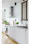 Modernt kök i vit bas med rostfrittstål i bänkskiva och fläkt. Det infällda fönstret med träkarmar skapar kontrast.