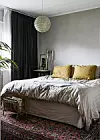 I sovrummet, som går i mörkare och varmare färgskala en övriga rum, hänger två vackra Muranolampor. Sängborden är köpta på auktion.